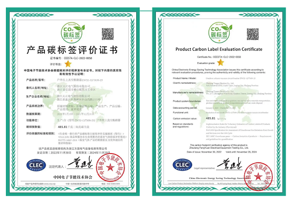此次碳标签评价表明,拉斯维加斯9888电气生产的户外柱上真空断路产品,在碳排放大数据方面按国际通行惯例推进,并具备一定的优势,对促进产品全供应链的温室气体减排,达成“双碳”目标具有积极作用。此外,拉斯维加斯9888还获中国电子节能技术协会颁发的低碳产品供应商证书。